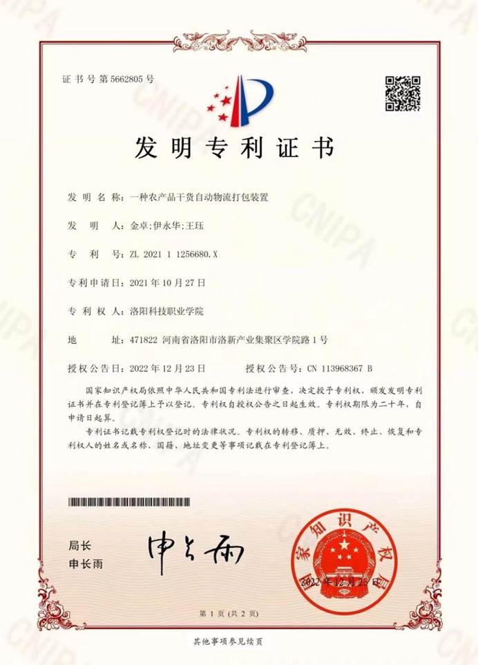 办公室主任、高级工程师)、王珏(副研究员)合力研发的“一种农产品干货自动物流打包装置”,获国家知识产权局授权并取得国家发明专利证书。