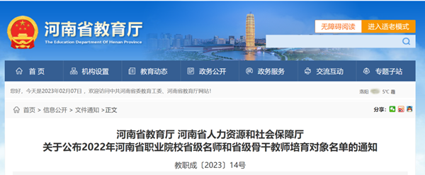 近日,河南省教育厅、河南省人力资源和社会保障厅发布了《关于公布2022年河南省职业院校省级名师和省级骨干教师培育对象名单的通知》(教职成〔2023〕14号),经教师申请、英皇娱乐场
