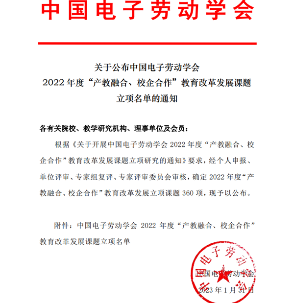 近日,中国电子劳动学会公布《2022年度“产教融合、校企合作”教育改革发展课题立项名单的通知》,经个人申报、英皇娱乐场