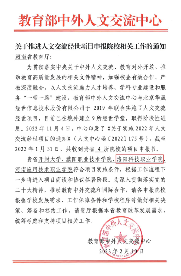 近日,教育部中外人文交流中心发布《关于推进人文交流经世项目申报院校相关工作的通知》文件,经过专家审核把关环节,确定了52所院校符合项目实施条件,洛阳科技职业英皇娱乐场
