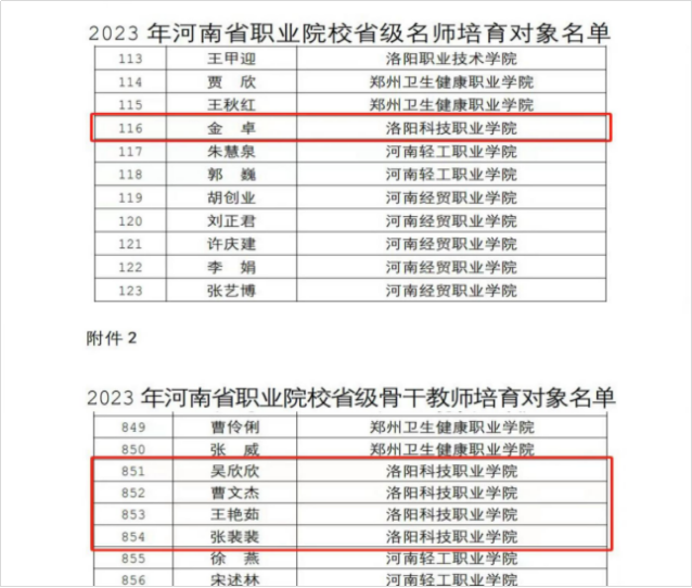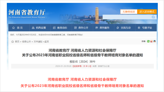 近日,河南省教育厅、河南省人力资源和社会保障厅发布了《关于公布2023年河南省职业院校省级名师和省级骨干教师培育对象名单的通知》,经教师申请、英皇娱乐场