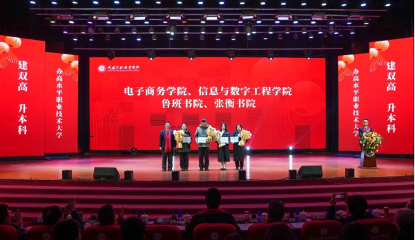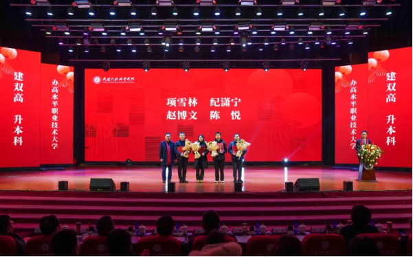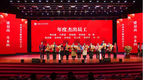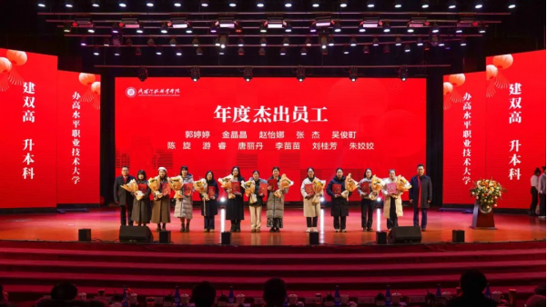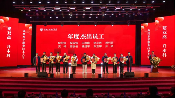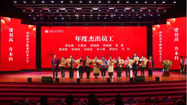 会上,校领导依次为“年度杰出员工”“年度最佳新人”“年度优秀组织”“年度杰出组织”颁发荣誉证书及奖杯,并送上鲜花。