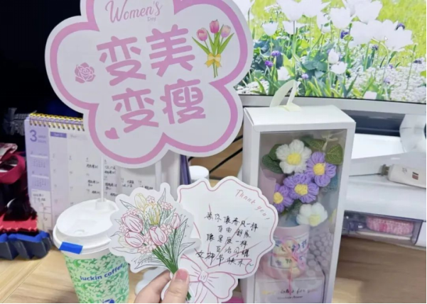 瑞幸咖啡的取餐台变身能量补给站,老师们拿着定制的专属姓名贴,领取的限定咖啡暖手更暖心!而各部门负责人为女职工们亲手送上伴手礼+手写贺卡,字里行间流露出真挚的情感与温暖的关怀。还有英皇娱乐场
