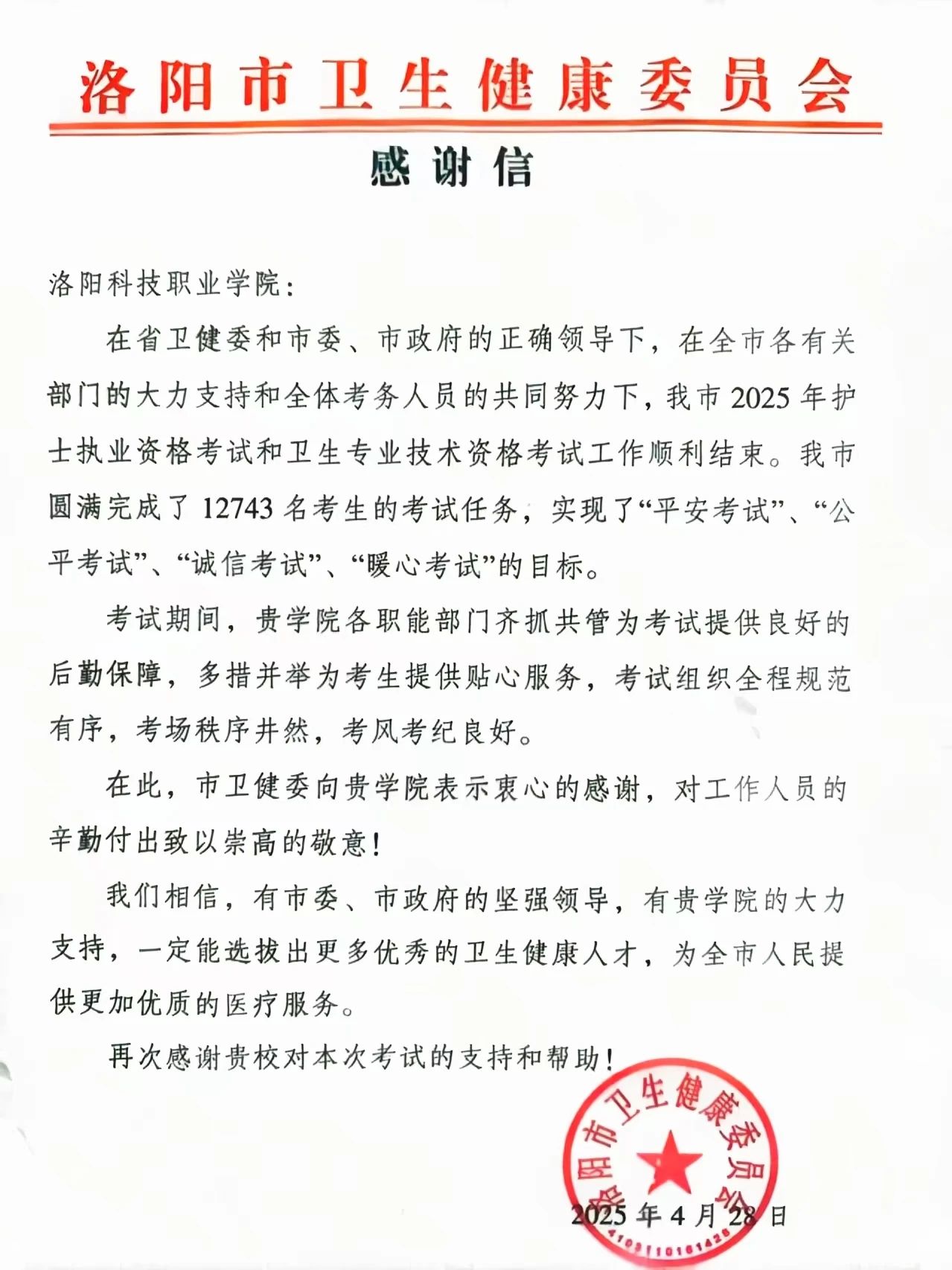 在考试组织过程中展现出的高度责任感、严谨的工作态度以及出色的协调能力,为洛阳市卫生专业人才选拔工作做出了积极贡献。