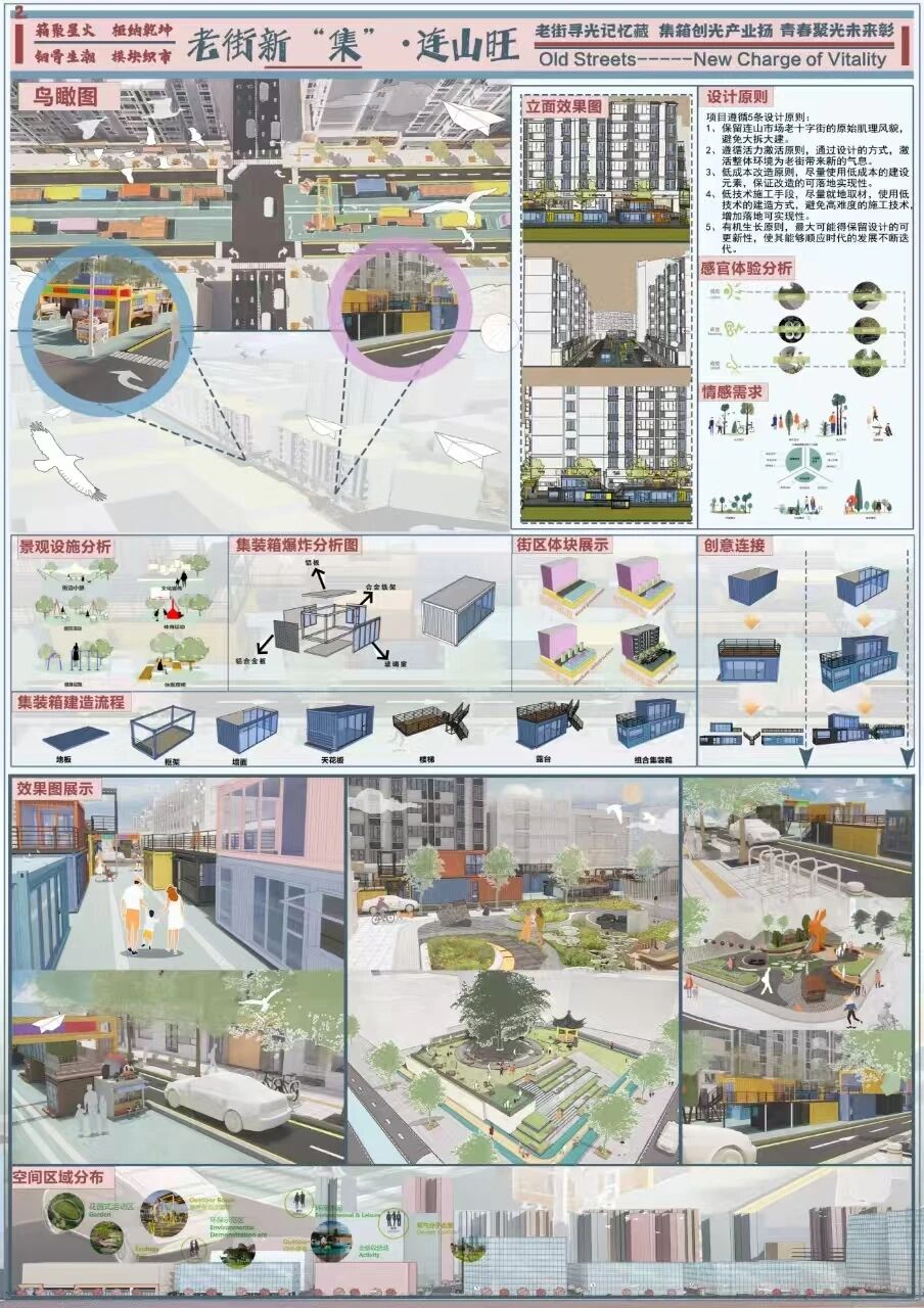 葫芦岛文旅专项大赛国赛三等奖作品《老街新“集”连山旺——连山市场老十字街改造》,以“老街活化”为主题,结合地域文化特色与数字化设计。在项目推进过程中,指导教师团队从空间流线优化到文化符号提炼进行全程指导,最终通过数字建模实现老街区历史场景的沉浸式还原,为传统街区注入新活力,彰显了英皇娱乐场