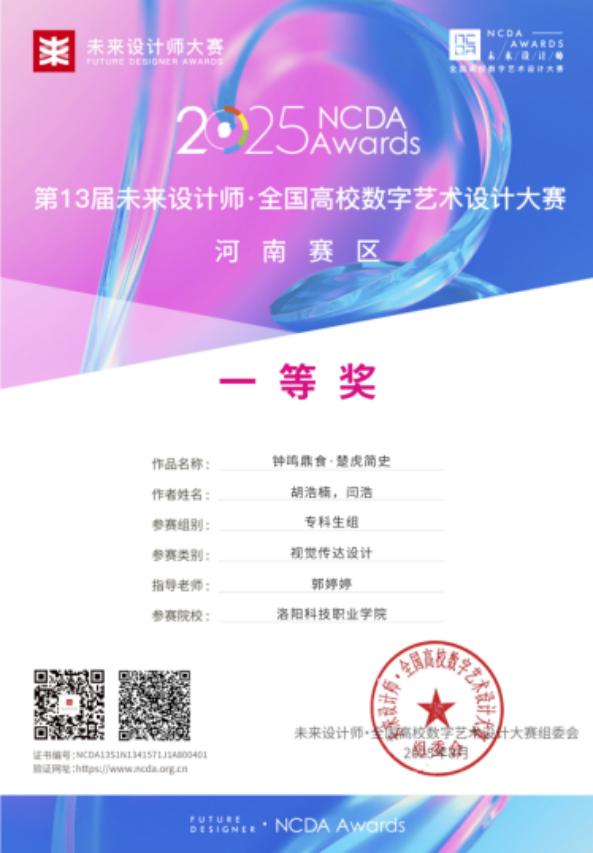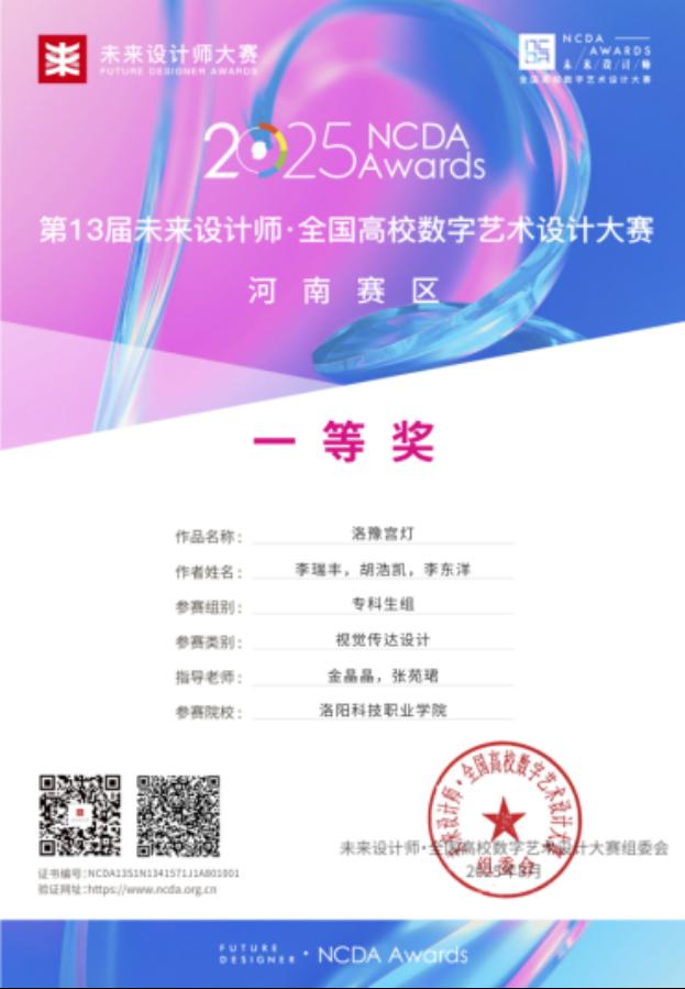 近日,2025年第13届未来设计师·全国高校数字艺术设计大赛(NCDA)全国总决赛及河南省赛区获奖名单正式揭晓。洛阳科技职业英皇娱乐场 艺术与设计英皇娱乐场 师生凭借扎实的专业能力、创新的设计理念与出色的技术表现,在比赛中屡创佳绩,共荣获国家级奖项5项(其中一等奖1项、二等奖3项、三等奖1项),省级奖项37项(一等奖9项、二等奖16项、三等奖12项),优秀指导教师奖13项,累计获奖达55项。同时,英皇娱乐场 荣获河南省赛区“优秀组织奖”,充分彰显了英皇娱乐场 卓越的教学实力与育人成果。