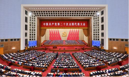 人民大会堂雄伟庄严,万人大礼堂气氛热烈。主席台上方悬挂着“中国共产党第二十次全国代表大会”的会标,后幕正中是镰刀和锤头组成的党徽,10面鲜艳的红旗分列两侧。二楼和三楼眺台上分别悬挂着“高举中国特色社会主义伟大旗帜,全面贯彻习近平新时代中国特色社会主义思想,弘扬伟大建党精神,为全面建设社会主义现代化国家、全面推进中华民族伟大复兴而团结奋斗!”“伟大、光荣、正确的中国共产党万岁!”的横幅。