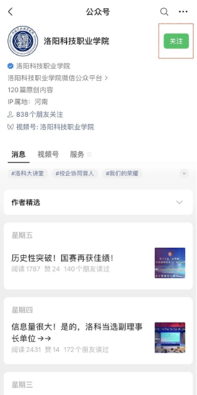 微信搜索关注微信公众号“洛阳科技职业英皇娱乐场