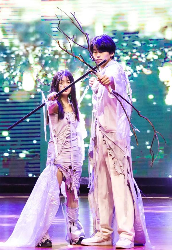 各参赛队精心设计方案,通过手绘、编织、粘贴、缝合等手法,将植物、床单、锡纸、报纸等废弃的旧物变成了别致的时装。不同材质的创意呈现、色彩的灵感运用、趣味性设计处理,体现出学生们的创意创新创作能力。设计师的完美创作和表演者的精彩演绎,为广大师生带来了一场文化与视觉盛宴。