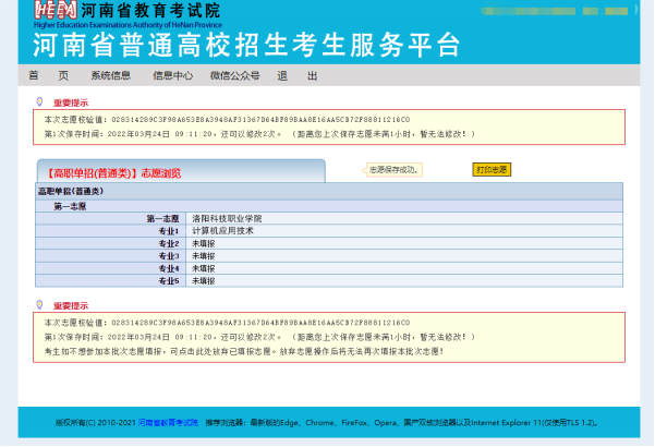 保存成功后,系统自动跳转到志愿信息浏览页面,显示考生已经填报的志愿信息,考生可以点击打印按钮打印志愿信息。