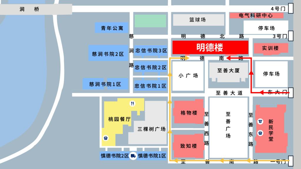 一号门、东大门入校,前往明德楼路线