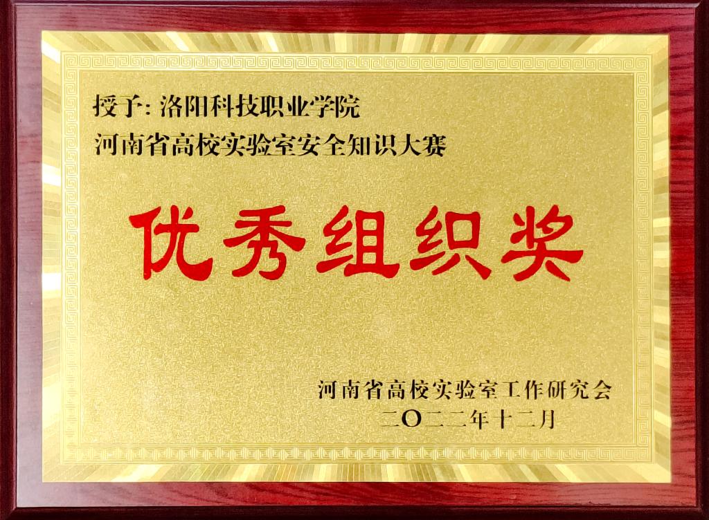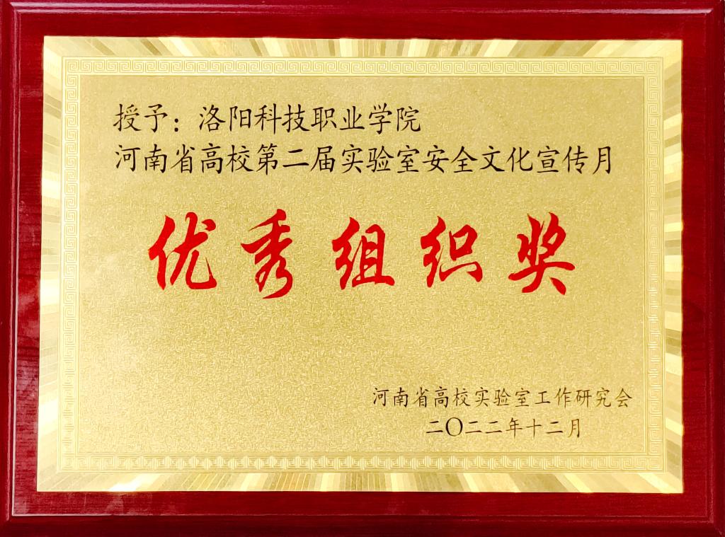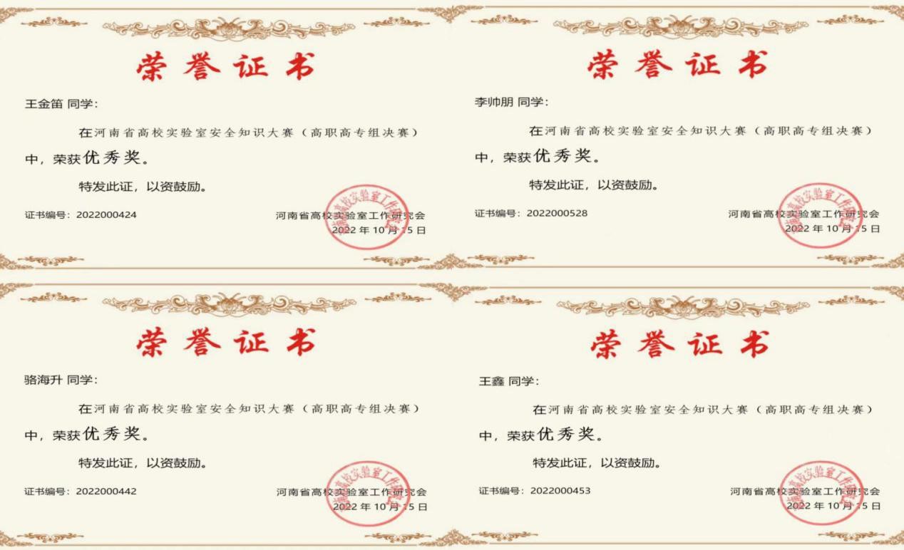 荣获“河南省第二届高校实验室安全文化宣传月优秀组织奖”和“河南省高校实验室安全知识大赛优秀组织奖”;李帅鹏、骆海升、王金笛、王鑫等同学获得“河南省高校实验室安全知识大赛个人优秀奖”。