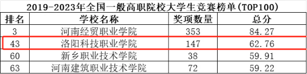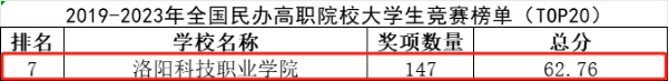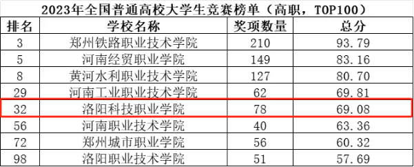 在《2023年全国普通高校大学生竞赛榜单(高职,TOP300)》中位列全国第32名,河南省第5名;在《2019-2023年全国一般高职院校大学生竞赛榜单(TOP100)》中位列全国第43名,河南省第2名;在《2019-2023年全国民办高职院校大学生竞赛榜单(TOP20)》中位列全国第7名,河南省第1名。以上三项排名均创历史新高。