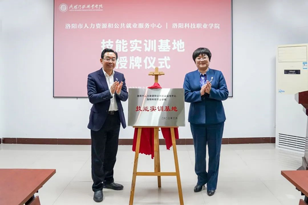 张育红和刘丽彬代表双方签订了《技能实训基地合作协议》,并为洛阳市人力资源和公共就业服务中心-洛阳科技职业英皇娱乐场