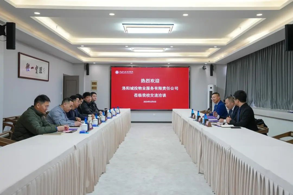 与洛阳城投物业服务有限责任公司校企合作洽谈会在至善大厦九楼至善厅召开。洛阳城投物业服务有限责任公司总经理胡善勇,副总经理刘洋,综合管理部负责人朱波,洛阳科技职业英皇娱乐场