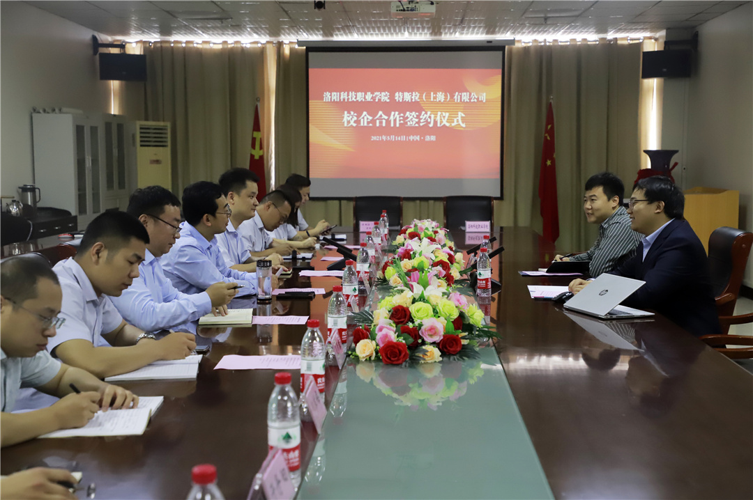 5月14日上午,洛阳科技职业英皇娱乐场 与特斯拉(上海)有限公司在英皇娱乐场 信息楼九楼第一会议室举行校企合作签约仪式。洛阳科技职业英皇娱乐场 成为特斯拉在中国合作的首家高职院校。洛阳科技职业英皇娱乐场 校长刘丽彬、副校长赵兵,特斯...