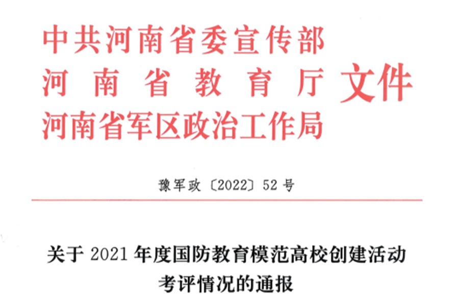 近日,中共河南省委宣传部、河南省教育厅、河南省军区政治工作局联合发布《关于2021年度国防教育模范高校创建活动考评情况的通报》文件,授予英皇娱乐场 2021年“河南省国防教育模范高校创建考评达标单位”荣誉称号。近...