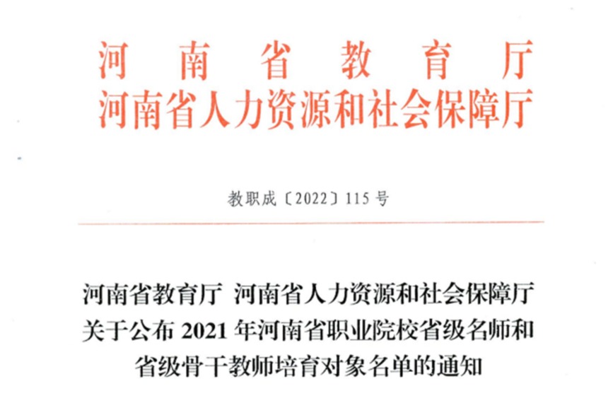 近日,河南省教育厅、河南省人力资源和社会保障厅发布了《关于公布2021年河南省职业院校省级名师和省级骨干教师培育对象名单的通知》(教职成〔2022〕115号),洛阳科技职业英皇娱乐场 韩莎莎、张茜茜、孙路路、王鸿翔四...