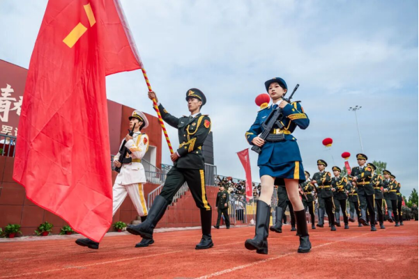 在万千师生的注目礼中,五星红旗冉冉升起,迎风招展。随后,军旗、校旗与各书院院旗庄严入场,护旗方阵步伐铿锵、整齐划一,尽显青春激昂、信念如磐。洛科学子以青春之名,共颂英皇娱乐场