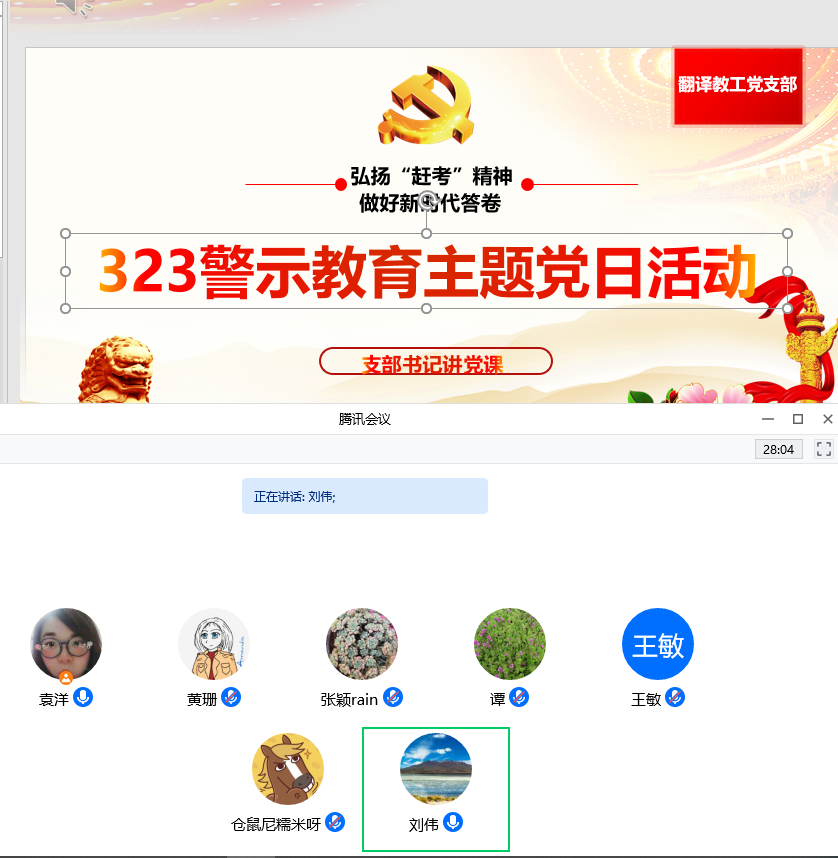 2022年3月23日13点,外国语学院翻译教工党支部于腾讯会议召开“3·23警示教育”主题党日活动,同时支部书记袁洋同志讲微党课《弘扬“赶考”精神 做好新时代答卷》。学院党委副书记刘朝武同志出席会议并发表讲话。